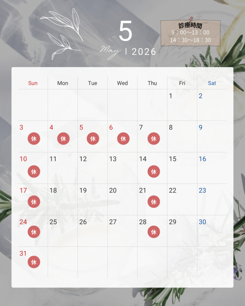 5月は木曜+日曜の休診、